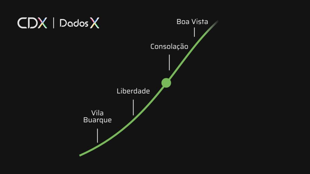 Utilizando uma metodologia própria, a Curva de Demanda (CDX), representada na imagem abaixo, analisamos o comportamento digital de milhares de consumidores — suas buscas, cliques, simulações, acesso a sites, vídeos visualizados e tempo de navegação — para mapear o verdadeiro estágio de maturidade de 17 bairros centrais, completamente baseado no comportamento dos clientes que estão na jornada de compra. O resultado é um gráfico em formato de curva que substitui o “achismo” pela clareza estratégica, revelando para onde a atenção do público realmente está se movendo.