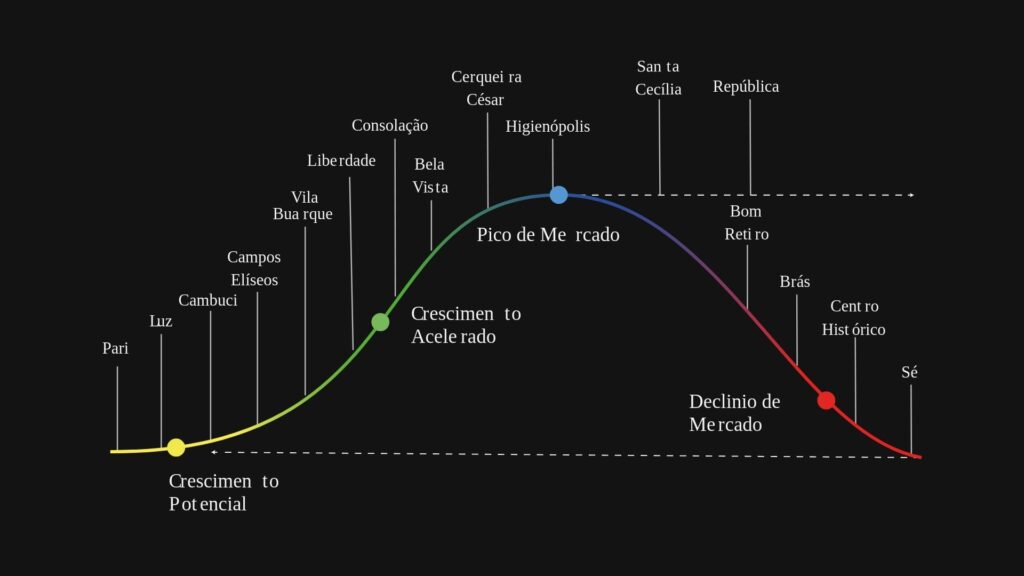 A análise posiciona cada bairro em uma curva visual de quatro estágios, como apresentada abaixo e vamos mergulhar em cada um deles.